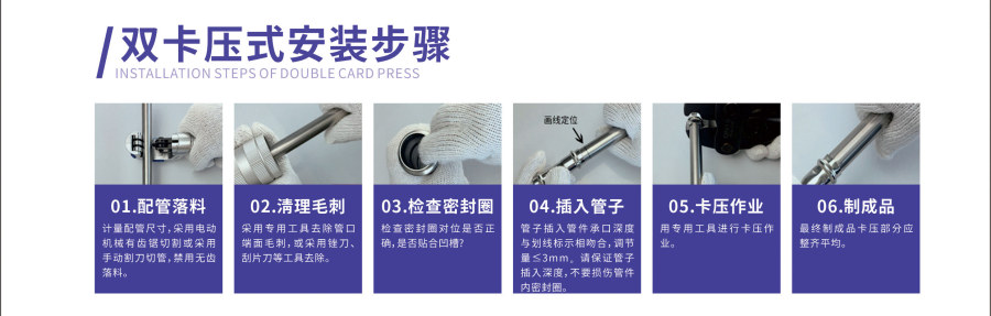 覆塑薄不銹鋼管連接方式有卡壓式、環(huán)壓式,不同的連接方式,管道的連接表面大不相同,但連接的效果是牢固穩(wěn)定、能達到止漏的安裝效果。