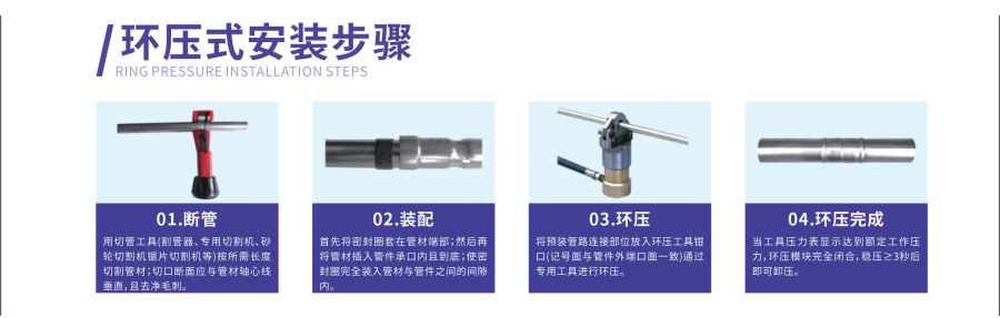 安裝時先將寬帶密封圈套在管材端部插入管件的承口通過專用工具擠壓管件的密封段使其端部下凹嵌入管材,如同絲扣相互咬合強力鎖緊;擠壓過程中密封腔里的橡膠材料會因承受壓力而蠕動直至填滿整個腔體進而實現(xiàn)可靠密封。